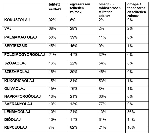 A növényi olajok változó arányban tartalmazzák az egyszeresen telítetlen és többszörösen telítetlen zsírsavak, illetve telített zsírsavak keverékét (lásd a lenti táblázatban). A telítetlen zsírsavak (egyszeresen- és többszörösen-) szerencsére túlsúlyban vannak bennük, emiatt lényegesen egészségesebbek, mint az állati eredetű vaj, és sertészsír (ezekben a telített zsírsavak vannak túlsúlyban, és koleszterint is tartalmaznak).